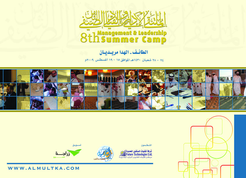 يعقد الملتقى الإداري والقيادي الصيفي الثامن بإذن الله وتوفيقه في الفترة من: 24 – 28 شعبان 1430هـ في فندق الهدا مريديان – الطائف، حيث يشارك نخُبة مختارة من المدربين الممارسين والخبراء الإداريين الذين مارسو العمل الإداري و قادو منظماتهم إلى النجاح وتحقيق الأهداف. وللمساهمة في تطوير بيئة الأعمال في المؤسسات الخاصة والحكومية، ركّز الملتقى على تقديم الجديد ونقل التجارب وصقل المهارات التي تساعد المدراء والموظفين على رفع مستوى الأداء وبناء بيئة عمل صحية تتيح لأفرادها فرصة الإبداع والتميّز.