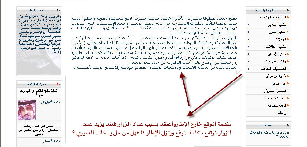 لأنك تقول لاحظت اذا كثروا الزوار في موقعك تحدث هذه المشكله وتفسير ذلك لأن قالب المتواجدون حالياً يطول فيتعدى طوله طول المحتويات في الوسط فتنزل محتويات الوسط الى الأسفل .. يعني حاول تخلي محتويات الوسط بطريقه او بأخرى تكون أطول بكثير من القوالب الي على يمين الصفحه ويسارها وبتنحل المشكله بإذن الله ..