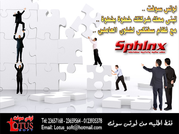 عندك موظفين الان لاتحتاج الى متابعة موظفينك بالطرق التقليدية القديمة والمعقدة حيث قامت شركة لوتس سوفت بانتاج اقوى برنامج للمرتبات وشئون العاملين فى مصر (HR ) برنامج سفنكس للمرتبات وشئون العاملين سفنكس يتميز بالسهولة والمرونة ويقوم بمتابعة كافة الشئون المالية والادارية التى تخص الموظفين