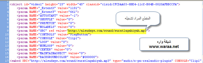 <p align="center"> <object id="video1" height="25" width="45" classid="clsid:CFCDAA03-8BE4-11cf-B84B-0020AFBBCCFA"> <param NAME="_ExtentX" value="1191"> <param NAME="_ExtentY" value="661"> <param NAME="AUTOSTART" value="-1"> <param NAME="SHUFFLE" value="0"> <param NAME="PREFETCH" value="0"> <param NAME="NOLABELS" value="0"> <param NAME="SRC" ref value="http://alsudays.com/sound/suratlagahiya1h.m p3"> <param NAME="CONTROLS" value="PlayButton"> <param NAME="CONSOLE" value="Clip1"> <param NAME="LOOP" value="0"> <param NAME="NUMLOOP" value="0"> <param NAME="CENTER" value="0"> <param NAME="MAINTAINASPECT" value="0"> <param NAME="BACKGROUNDCOLOR" value="#000000"> </p>