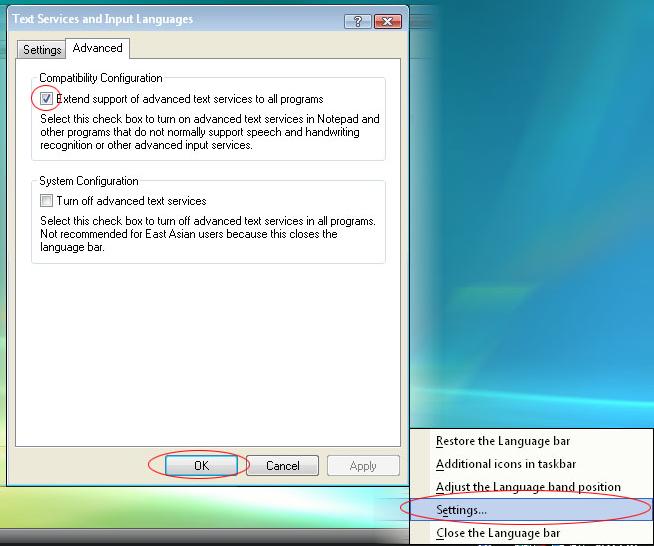 قم بالضغط بزر الماوس الأيمن على أداة اللغة وتكون عبارة عن حرفي (AR) أو (EN) أسفل يمين شريط المهام