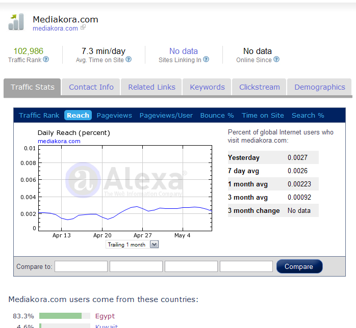 ومرفق فى الموضوع صوره توضيحيه لترتيب الموقع فى اليكسا ولمشاهده الترتيب هنامع العلم ان الموقع عمره لم يتعدى 5 اسابيع ولكن مع فيفو المطوره بقالب ماى ايجى وسهوله وبساطه ادارته تطور الموقع حتى وصل فى ايام قليله جدا لتلك المكانه الرائعه
