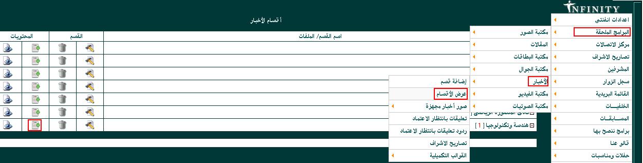 ادخل إلى لوحة تحكم انفنتى ثم البرامج الملحقة >> مكتبة الأخبار >> عرض الأقسام >> الضغط على ايقونة إضافة محتوى المعلمة بالصورة هنا أمام القسم المُراد إضافة الخبر إليه