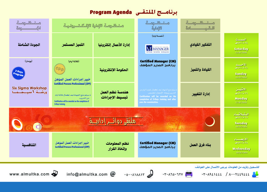 يعقد الملتقى الإداري والقيادي الصيفي الثامن بإذن الله وتوفيقه في الفترة من: 24 – 28 شعبان 1430هـ في فندق الهدا مريديان – الطائف، حيث يشارك نخُبة مختارة من المدربين الممارسين والخبراء الإداريين الذين مارسو العمل الإداري و قادو منظماتهم إلى النجاح وتحقيق الأهداف. وللمساهمة في تطوير بيئة الأعمال في المؤسسات الخاصة والحكومية، ركّز الملتقى على تقديم الجديد ونقل التجارب وصقل المهارات التي تساعد المدراء والموظفين على رفع مستوى الأداء وبناء بيئة عمل صحية تتيح لأفرادها فرصة الإبداع والتميّز.