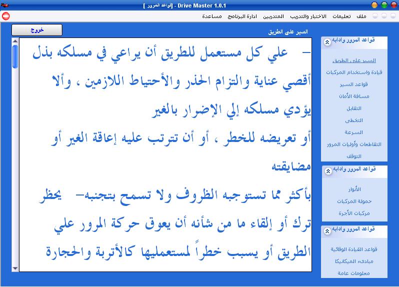 تدور فكرة البرنامج حول انشاء نظام مساعد بالحاسب الالى لتدريب المتدربين على امتحانات المرور والتحكم بالمتدربين وما الى ذلك عن طريق الكمبيوتر